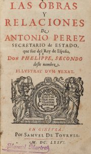 .1676.. LIBRO: .(HISTORIA).. .LAS OBRAS Y RELACIONES DE ANTONIO PEREZ, SECRETARIO DE ESTADO, QUE FUE DEL REY DE ESPAÑA DON PHELIPPE SECONDO DESTE NOMBRE.. Ginevra: Samuel de Tournes, 1676. Dos vol. en 8º menor. 20 h + 1129 p. Presentado en dos...