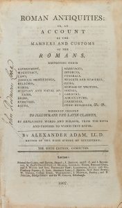 .1807.. LIBRO: .(HISTORIA DE ROMA).. .ADAM, ALEXANDER:. .ROMAN ANTIQUITIES OR, AN ACCOUNT OF THE MANNERS AND CUSTOMS OF THE ROMANS.. London: Printed C. and R. Baldwin, 1807. 8º mayor. XIV p. + 1 h. + 616 p. Enc. en plena piel de época, tejuelo,...
