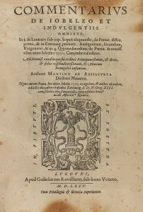 .1575.. LIBRO: .(RELIGIÓN).. .AZPILCUETA, MARTINO:. .COMMENTARIUS DE IOBELEO ET INDULGENTIIS OMNIBUS.... Lugduni: Apud Guliermum Rouillium, 1575. 8º mayor. 8 h. + 84 fol. + 4 h. Falto de las dos últimas hojas del índice [Sign. 2Z1 y 2Z2]. Portada...