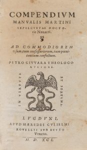 .1591.. LIBRO: .(RELIGIÓN).. .AZPILCUETA, MARTIN:. .COMPENDIUM MANUALIS... ad commodiorem usum tum confessariorum tum poenitentium confectum / Petro Givvara theologo avctore.. Lugduni: Apud Haeredes Gulielmi, 1591 [en portada y colofón]. 12º. 6 h....