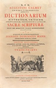 .1759.. LIBRO: .(BIBLIA-DICCIONARIO).. .CALMET, AGUSTIN:. .DICTIONARIUM HISTORICUM, CRITICUM, CHRONOLOGICUM, GEOGRAPHICUM ET LITERALE SACRAE SCRIPTURE.. Augsburgo: Augustae Vindelicorum, 1759. 2 vol. en folio mayor. I: (Tomus primus A-L). Retrato...