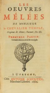 .1694.. LIBRO: .(HUMANIDADES).. .CHEVALIER, TEMPLE:. .LES OEUVRES MÊLÉES.. Utrecht: Libr. Antoine Schouten, 1694. 8º menor. 6 h. + 283 p. + 443 p. Dos partes con portadas propias en un vol., la primera portada a dos tintas. Cabeceras,...