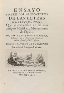 .1752.. LIBRO: .(CALIGRAFÍA).. .VELAZQUEZ, JOSEPH:. .ENSAYO SOBRE LOS ALPHABETOS DE LAS LETRAS DESCONOCIDAS, QUE SE ENCUENTRAN EN LAS MAS ANTIGUAS MEDALLAS, Y MONUMENTOS DE ESPAÑA.. Madrid: Oficina de Antonio Sanz, 1752. 4º. 8 h. + 163 p.+ 2 h.+...