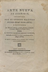 .1776.. LIBRO: .(CALIGRAFÍA).. .DIAZ MORANTE, PEDRO:. .ARTE NUEVA DE ESCRIBIR, INVENTADA POR EL INSIGNE MAESTRO... ILUSTRADA POR D. FRANCISCO XAVIER DE SANTIAGO PALOMARES.. Madrid: Imp. Antonio de Sancha, 1776. Folio menor. Portada + XXVIII p. + 1...