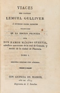 .1824.. LIBRO: .(LITERATURA).. .SWIFT, JONATHAN:. .VIAGES DEL CAPITAN LEMUEL GULLIVER. Traducidos de la edición francesa por Don Ramon Máximo Spartal.. Madrid: Imp. Sancha, 1824. 3 vol. en 8º menor. I: 2 h. + XXXVI + 255 p. + 2 lám. II: 267 p. +...