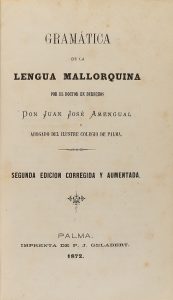 .1872.. LIBRO: .(LINGÜÍSTICA).. .AMENGUAL, JUAN JOSÉ:. .GRAMÁTICA DE LA LLENGUA MALLORQUINA.. Palma: Imp. de P. J. Gelabert, 1872. 8º mayor. 6 h. + 356 p. + 1 h. Últimas p. algo tostadas. Enc. en media piel de época, nervios. Exlibris de...