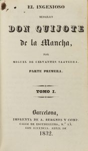 .1832.. LIBRO: .(CERVANTINA).. .CERVANTES, MIGUEL DE:. .DON QUIJOTE.. Barcelona: Bergnes y Cía, 1832. 6 vol. 12º. I: 352 + 2 lám. II: 345 p. + 2 lám. 345 p. + 2 lám. III: 345 p. + 2 lám. IV: 366 p. + 2 lám. V: 381 p. + 2 lám. VI: 367 p. + 2...