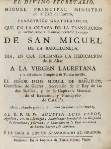 Loreto Panegyrico Gratulatorio, que en la octava de la translacion de nuestro amo a su nuevo templo de San Miguel de la Barceloneta... .2 h. + 32 p. CCPB 459616-1.. .[Sigue:] .Discurso sobre la necesidad de una Farmacopea nueva en la ciudad de Barcelona... .4 h. + 27 p.. .[Sigue:] .Iris de paz del Carmelo Drama musico: en que la historia de la carmelitana... .6 h. [Sigue:] .Oracion funebre en las exequias solemnes... a la ven.ble memoria y eterno descanso ... D. Fr. Rafael Lassala.... 34 p.+ 1 lám. plegada. [Sigue:]. Oracion funebre... Fr. Henrique Florez.. 2 h. + 28 p. [Sigue:] .El amor de sta. Maria Magdalena. Sermon... .2 h. + 32 p.. [Sigue:] Juicio del tratado de Educación del M. R.P.D. Cesareo Pozzi. Lo escribia... Don Juan Bautista Muñoz. .87 p.. .Enc. en pleno pergamino de época, desprendido. A examinar.. ..