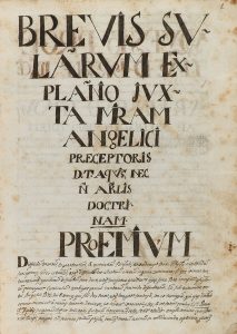 .ca. 1700.. MANUSCRITO: .TOMAS DE AQUINO:. .BREVIS SULARUM EX PLANATIO JUXTA MIRAM ANGELICI PRECEPTORIS... Volumen manuscrito de unas 270 p. en 8º. Enc. en pergamino de época, semidesprendido. Dibujo con filigrana a pluma en forma de paloma. Lleva...
