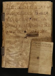 ORDINARIA DE BAR[CELO]NA.. Barcelona, 1767-1868. 4º mayor. 63 h., 46 de las cuales manuscritas en recto y verso. Curioso documento que relaciona todas las cuentas de la dicha causa pía del histórico y rico gremio. Enc. en pleno pergamino de época, lomera y plano anterior rotulado, con solapa y restos de cierre. [Más:] .LLIBRETA DE RECIBOS DE LAS DESCALSAS DE MATARÓ. .Mataró, 1735-1864. 12º. 29 h., 17 de las cuales manuscritas en recto y verso. Enc. en pleno pergamino de época con solapa, plano anterior rotulado.