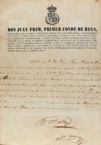 está impreso con el escudo y títulos de Juan Prim i Prats, primer conde de Reus, título dado por Isabel II. En este documento se reconocen las labores del doctor Pedro Palau y Flaquer en el hospital de sangre que en 1843 atendió a los defensores de la reina en San Andrés de Palomar.