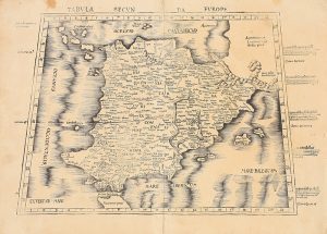 .1520 ca.. MAPA: .(PENÍNSULA IBÉRICA).. .[WALDSEEMÜLLER, MARIN:].. .TABULA SECUNDA EUROPE.. Xilografía de proyección cónica. 46 x 64 cm papel. Contiene hidrografía y accidentes geográficos. En la obra ´Geographia´ del astrónomo y geógrafo...