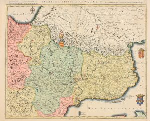 .1692 ca.. MAPA: .COVENS, I. y MORTIER, C.:. .THEATRE DE LA GUERRE EN ESPAGNE.. Amsterdam. Grabado calcográfico del noreste peninsular que abarca Cataluña, Aragón, Navarra, y parte de las Castillas. Bien coloreado, con los escudos de Cataluña,...