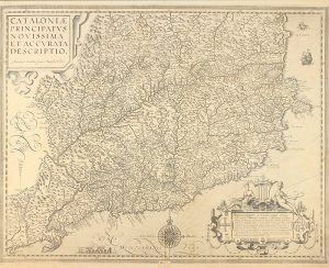 en lengua italiana. Primer mapa de Catalunya en el raro tiraje de la edición italiana ( 1608-1612), que al dorso contiene el texto (en italiano) del historiador catalán Francesc Diago, escrito por orden de la Generalitat. Colomer 2.