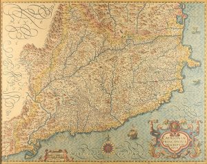 .1628 ca.. MAPA: .(CATALUNYA).. .MERCATOR; HONDIUS:. .CATALONIAE PRINCIPATUS DESCRIPTIO NOVA.. Mapa grabado al cobre, coloreado. plancha 38 x 48 cm. Bonito coloreado, monstruos marinos, lleva rosa de los vientos y dos cartelas en la parte inferior.