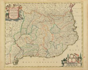 .1660 ca.. MAPA: .(CATALUNYA).. .WIT, F. DE:. .ACCURATISSIMA PRINCIPATUS CATALONIAE ET COMITATUUM RUSCINONIS ET CERRETANIAE DESCRIPTIO.. Mapa grabado al cobre y coloreado, plancha 50 x 58 cm, 52,5 x 65 cm papel. Cartelas y límites coloreados....