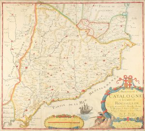 .1686.. MAPA: .(CATALUNYA).. .DU-VAL, P.:. .LA PRINCIPAUTÉ DE CATALOGNE ET LE COMTÉ DE ROUSSILLON, AVECQUE LES ANCIENNES ET LES NOUVELLES BORNES DES RYAUMES DE FRANCE ET D´ESPAGNE, LES PASSAGES DES PYRENNÉES ET LES AUTRES ROUTES.. Paris: en casa...