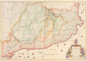 .1707.. MAPA: .(CATALUNYA).. .DUVAL y PLACIDE, P.:. .LA CATALOGNE DEDIÉE AU ROY.. Paris: Chez Duval, 1707. Realizado en dos planchas. 69 x 102 cm huella, 73,5 x 104 cm papel. Coloreado, también la cartela grabada y los barcos situados en el mar....