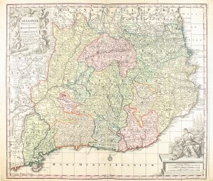.1728 ca.. MAPA: .(CATALUNYA).. .SEUTTERI, MATTH.:. .CATALONIA PRINCIPATUS ET RUSCINONIS AC CERRETANIAE COMITATUUM EXACTISSIMA DELINEATIO.. Grabado al cobre, 50 x 58 cm huella y 52 x 62 cm papel. Bonito coloreado. Cartelas decorativa con angelotes....