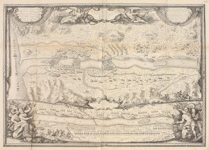 ligeramente oscurecida, alguna pequeña rasgadura marginal y alguna arruga. Soberbia representación de la batalla que enfrentó al ejército francés contra las fuerzas comandadas por el duque de Escalona, capitán general del ejército en Cataluña. La imagen está enmarcada en una orla geométrica, tres grandes cartelas en la parte superior, la central sostenida por ángeles con trompetas, en la parte inferior con cartela propia ´Ordre de Bataille...´ flanqueada la imagen por alegorías de guerreros cautivos. Es el plano de mayor dimensión de la obra de Beaulieu.