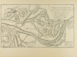 .1720 ca.. MAPA: .(GIRONA).. .FER, N. DE:. .GIRONE VILLE FORTE D´ESPAGNE DE LA PROVINCE DE CATALOGNE, SUR LA RIVIERE DU TER.. Paris: chez le Sr. de Fer, s.a. 19 x 32 cm huella, 25,5 x 34 cm papel. Presenta la posición de defensa y ataque durante la...