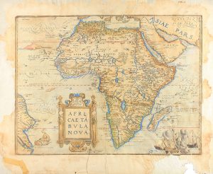 .1570.. MAPA: .(AFRICA).. .[ORTELIUS]:. .AFRICAE TABULA NOVA.. Antuerpiae, 1570. Mapa calcográfico. Papel: 48 x 48 cm; huella: 38 x 50 cm. Reverso con texto en italiano. Iluminado a mano. Laminado, tosco refuerzo parcial, faltas en los márgenes,...