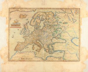 .1580 ca.. MAPA: .(EUROPA).. .ORTELIUS, ABRAHAM:.. .EUROPAE.. [Amberes, 1587]. Mapa calcográfico. Papel: 47 x 58 cm. Huella: 35 x 47 cm. Iluminado a mano. Reverso con texto en italiano y capital iluminadda. Laminado, pérdida parcial de los...