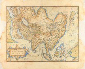 .1580 ca.. MAPA: .(ASIA).. .ORTELIUS:. .ASIA NOVA DESCRIPTIO.. [Amsterdam], 1580 ca. Papel: 47 x 58 cm; huella: 35 x 47 cm. Reverso con texto en italiano y capital ilustr. Iluminado a mano. Laminado, pérdida parcial de los márgenes, sin afectar...