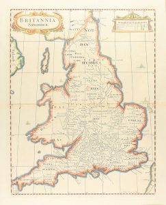 .[1722].. MAPA: .(INGLATERRA).. .[GIBSON, EDMUND; CAMDEM, WILLIAM]:. .BRITANNIA. Saxonica.. [London, 1722]. Mapa calcográfico. 45 x 39 cm; huella: 39 x 30,5 cm. Límites coloreados. Antigua señal de doblez central. Presentado en paspartú.