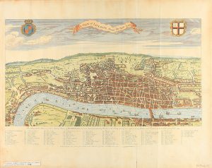 restauración. Bello plano de Londres publicado en el frontispicio del vol. I de la obra ´History of London...´ de Maitland, reducido del plano de Argas ´Civitas Londinum´.