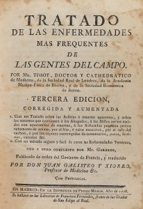 .1778.. LIBRO: .(MEDICINA).. .TISSOT:. .TRATADO DE LAS ENFERMEDADES MAS FRECUENTES DE LAS GENTES DEL CAMPO.. Trad. Juan Galisteo y Xiorro. Madrid: Imp. Pedro Marin, 1778. 8º. 8 h. + 620 p. + 2 lám. plegadas, grabadas por Moreno. Enc. en pasta...