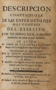 .1761.. LIBRO: .(MEDICINA).. .VAN-SWIETEN, BARON DE:. .DESCRIPCION COMPENDIOSA DE LAS ENFERMEDADES MAS COMUNES DEL EXERCITO, CON UN NUEVO, FACIL, Y SEGURO METHODO DE CURAR EL MAL VENEREO.. Trad. Agustín Argüello y Castrillo. Madrid: Imp. Joaquin...