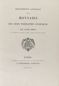 .1872.. LIBRO: .(NUMISMÁTICA).. .HEISS, ALOISS:. .DESCRIPTION GENERALE DES MONNAIES DES ROIS WISIGOTHS D´ESPAGNE.. Paris: Imprimerie Nationale, 1872. Folio menor. 1. h.+ III p. + 185 p. y 13 lám. Enc. en media piel. Incluye una sinopsis histórica...