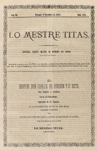 .1869-1872.. REVISTA: .(CARLISMO).. .LO MESTRE TITAS. Donará l´acostumada llizó mentres pugui.... Barcelona, Imp. del Mestre Titas, Imp. de Cayetano Campins. Folio. 131 núm. consecutivos de 4 p. c/u. 1869-1872. Del núm. 45, 7 octubre de 1869 al...