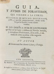 .1753.. LIBRO: .(GUIA FORASTEROS).. .LIÑAN, ANTONIO:. .GUIA Y AVISOS DE FORASTEROS, QUE VIENEN A LA CORTE: Historia de mucha diversion... Se les enseña a huir de los peligros que hay en la Corte.... Madrid: Imp. de Francisco Xavier Garcia, 1753....