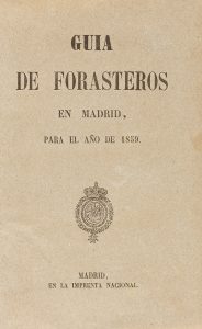 .1859.. LIBRO: .(VIAJES).. .GUIA DE FORASTEROS EN MADRID PARA EL AÑO 1859.. Madrid: Imp. Nacional, 1859. 8º. 622 p. y un estado plegado. Retrato grabado de la reina. [Sigue:] .ESTADO MILITAR DE ESPAÑA E INDIAS AÑO DE 1859.. Idem. 296 p. sin el...