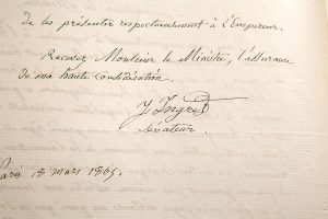 J'ai donc l'honneur Monsieur le Ministre de remettre à Votre Excellence ma démission de Membre de la Commission pour l'Exposition universelle de 1867»