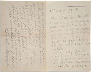 L.A.S. «Claude Monet», Giverny par Vernon, Eure 1er mars 1915, à Léon WERTH ; 4 pages in-8 au crayon à l'adresse de Giverny.