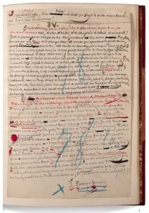 MANUSCRIT autographe signé «J. Barbey dAurevilly», Un Nouveau Spectacle dans un fauteuil, [1881] ; 3 pages infol. découpées pour l'impression et remontées sur ff. de papier fort, le tout relié en un volume in-fol., maroquin rouge à coins.