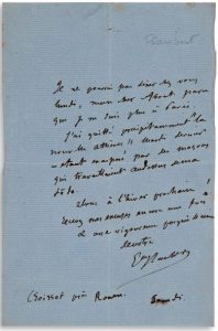 L.A.S. «Gve Flaubert», Croisset près Rouen samedi [23 mai 1868], à Edmond ABOUT ; 1 page in-8 sur papier bleu.