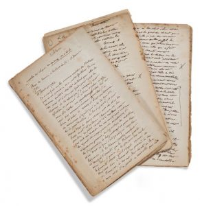 3 CARNETS autographes ; environ 16, 10 et 11 pages in-8 écrites au recto dans 3 petits cahiers cousus (quelques passages ont été découpés pour être collés dans un manuscrit).