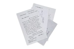 19 septembre 1986. Green remercie le journaliste allemand pour son «admirable présentation de notre entretien. Cette grande et belle page a été pour moi une agréable surprise et j'ai été très sensible à la fidélité et à la précision de votre compte rendu» ; il le félicite d'avoir su orienter cette conversation sur «les grands problèmes de la vie spirituelle. [...] En tant que catholique, je suis toujours heureux d'une occasion de porter témoignage»... 8 février 1987 : «Je suis en train de terminer les épreuves de mon nouveau livre, Les Pays lointains, et j'ai appris avec joie que le traducteur en Allemagne serait M. Kossado»... 13 septembre 1988 : il a passé un été «de travail» et part dans les Pyrénées : «je vais continuer et (espère) finir mon nouveau roman qui a déjà 700 pages»... 21 décembre 1988 : il travaille «comme un forçat aux derniers chapitres de mon roman (la suite des Pays lointains) qui doit paraître fin avril et dont 900 pages sont chez l'imprimeur. Il me faudrait des jours de 40 heures»... Etc