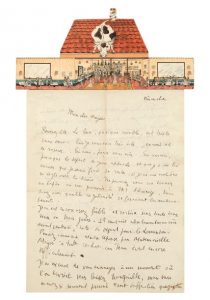 L.A.S. «Raymond Radiguet», Dimanche [début mai ? 1922], à Louis MOYSÈS ; 2 pages in-4, encadrée avec un prospectus publicitaire illustré du cabaret Le Bœuf sur le toit.