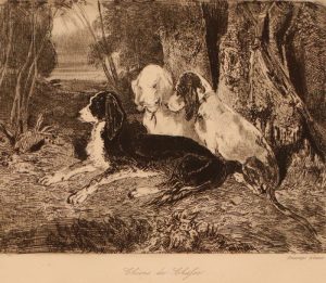 BLAZE (Elzéar). Histoire du chien. Paris, Au dépôt de la librairie, 1846. In-8, 13,5 x 21 cm, 2 ff., VIII + 460 pp., frontispice, demi-chagrin noir, dos à nerfs, tête dorée (reliure de la fin du XIXe siècle). Édition originale de 1843 avec le titre renouvelé. Illustré d’un frontispice gravé à l’eau-forte qui manque souvent.