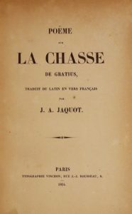 GRATIUS. Poëme sur la chasse… Paris, Typographie Vinchon, 1854. In-4, 15 x 24 cm, 48 pp., …