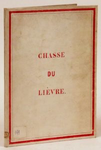 [HABERT (Pierre)]. La chasse du lièvre avecques les lévriers. Paris, Jannet, 1849. In-8, 16,5 x 22 cm, 16 pp., vélin ivoire, titre et double encadrement rouge sur les plats, dos lisse orné de filets rouges, tranches rouges (reliure de la fin du XIXe siècle). Très rare édition, tirée à 62 exemplaires, de ce poème cynégétique paru en 1599.
