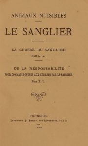 [LAMBERT (Lucien & E.)]. Animaux nuisibles. Le sanglier. La chasse du sanglier. De la responsabilité pour dommages causés aux récoltes par le sanglier. Tonnerre, Imprimerie P. Bailly, 1878. In-8, 13,5 x 20,5 cm, 104 pp., vélin ivoire, titre et double encadrement rouge sur les plats, dos lisse orné de filets rouges, tranches rouges (reliure de l’époque). Édition originale de cette impression de Tonnerre.