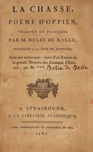 OPPIEN. La chasse… avec des remarques, suivi d'un extrait de la grande histoire des animaux d'Eldémiri… Strasbourg, Librairie académique, 1787. In-8, XVI + 212 pp., 1 f., 78 pp. (chiffrées 147-224), vélin ivoire, titre et double encadrement rouge sur les plats, dos lisse orné de filets rouges, tranches rouges (reliure de la fin du XIXe siècle). Première édition française en prose du célèbre De Venatione d'Oppien, donnée par l'académicien J.-N. Belin de Ballu. Le texte est accompagné pour la première fois d'un important appareil critique (104 pp.) mettant en lumière les connaissances zoologiques et les techniques de chasse de l'époque.