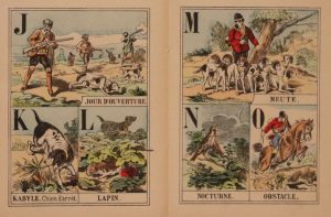 ALPHABET DE LA CHASSE. [Épinal], Pellegrin, vers 1880. In-12, 15,5 x 20 cm, 8 ff., broché. Charmant petit album rare d’images d’Épinal.