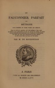 BOISSOUDAN (Jacques-Élie de). Le fauconnier parfait ou Méthode pour dresser et faire voler les oiseaux… Paris, pour la Société des bibliophiles, 1866. In-8, 12,5 x 20 cm, 2 ff., XII + 72 pp., broché, entièrement non rogné (couverture moderne). Rare édition de ce classique de fauconnerie, composée vers 1745.